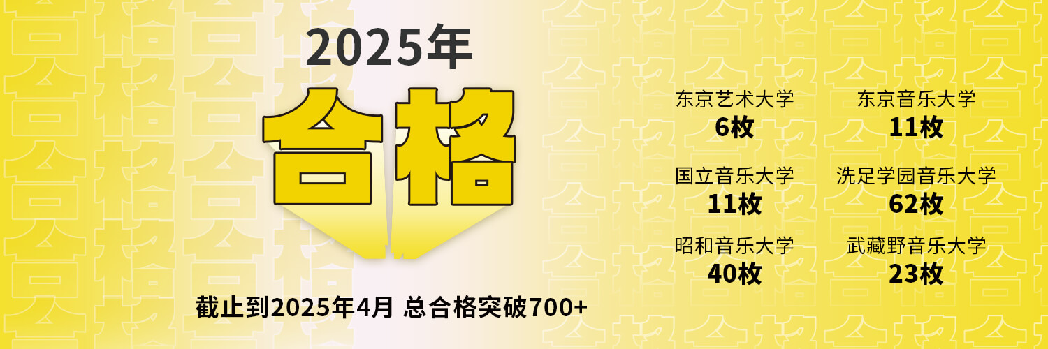 合格院校包括但不限于:东京艺术大学、国立音乐大学、东京音乐大学、武藏野音乐大学、昭和音乐大学、桐朋学园大学、洗足学园音乐大学等。